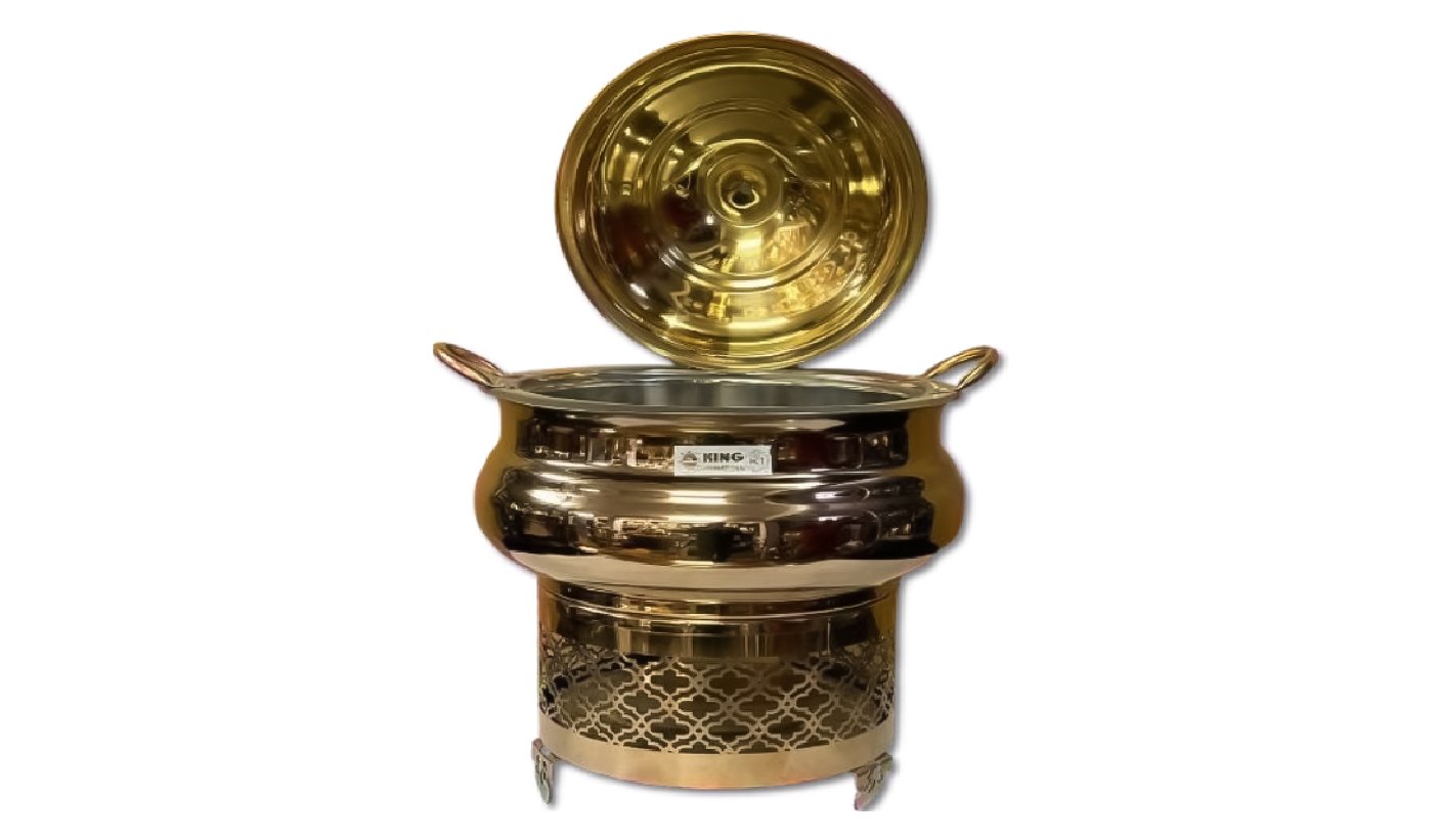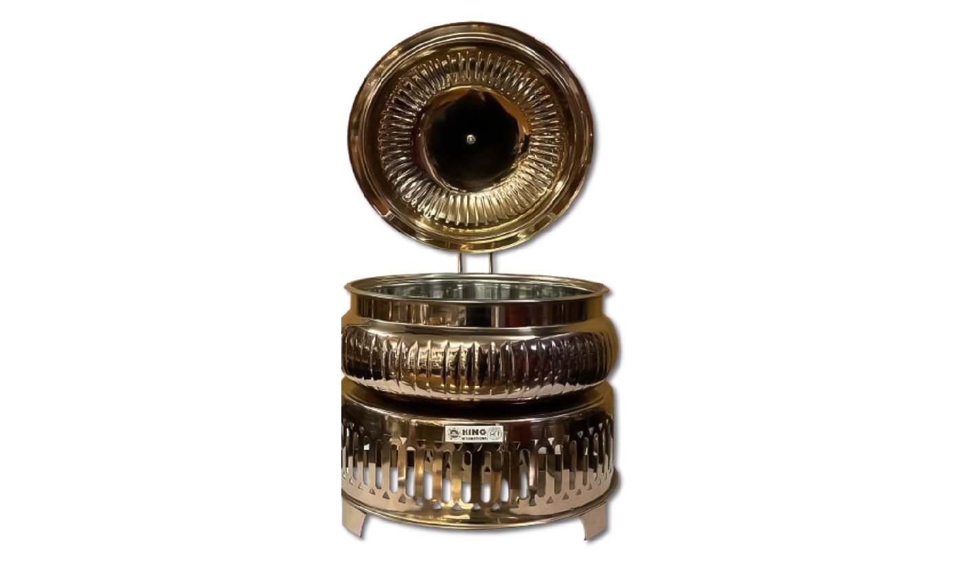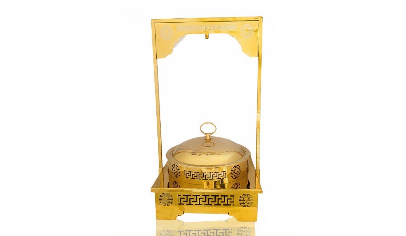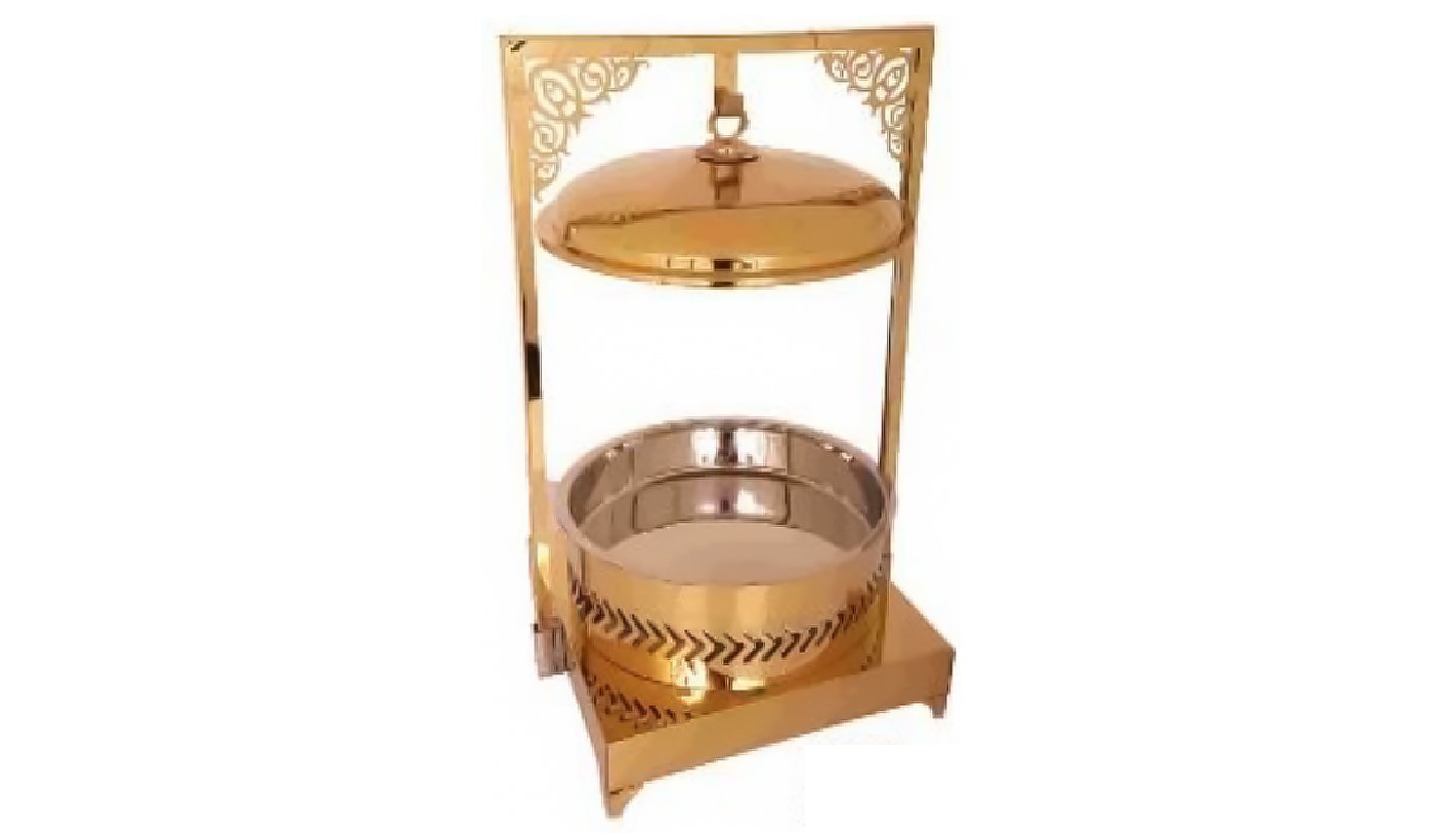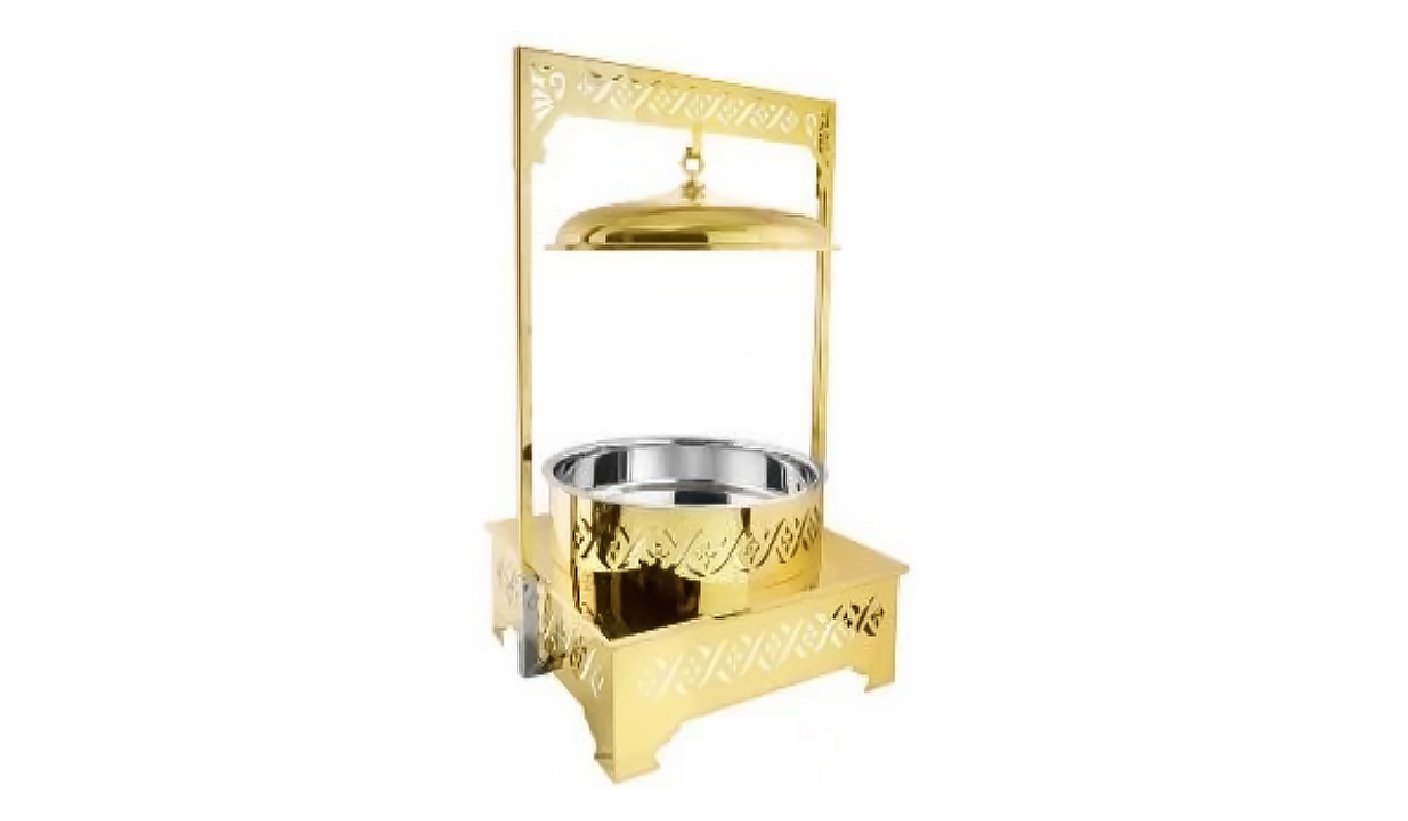 Gold Steel Round Chafing dish with Hanging Lid and Square Double Stand | KI-GCF- 53